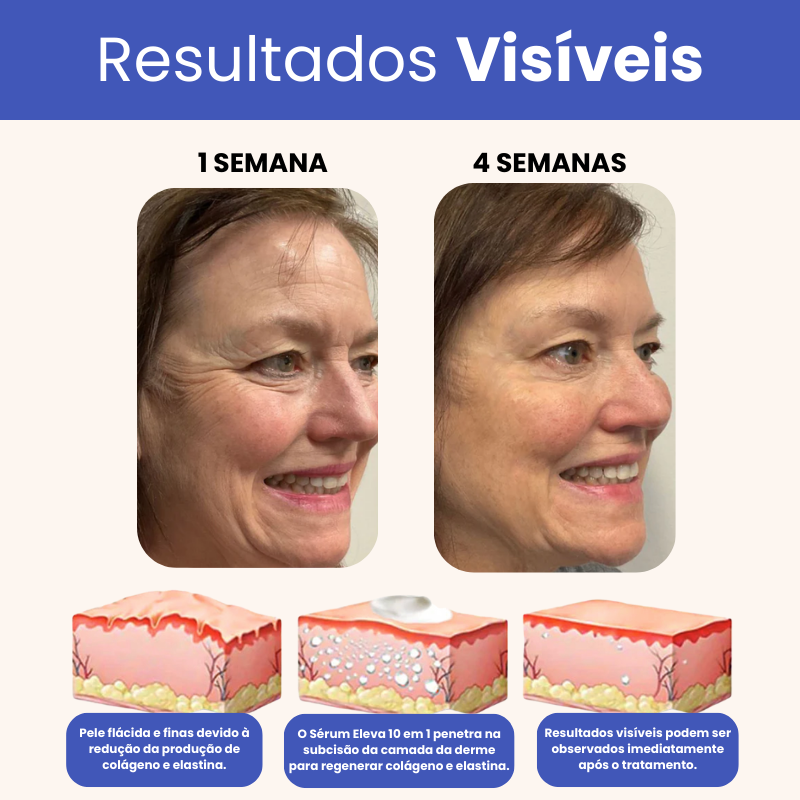 Eleva 10 em 1™ utiliza uma concentração avançada e altamente pura do ingrediente, que penetra profundamente na pele, promovendo firmeza, elasticidade e uma aparência visivelmente mais jovem já nas primeiras semanas de uso.